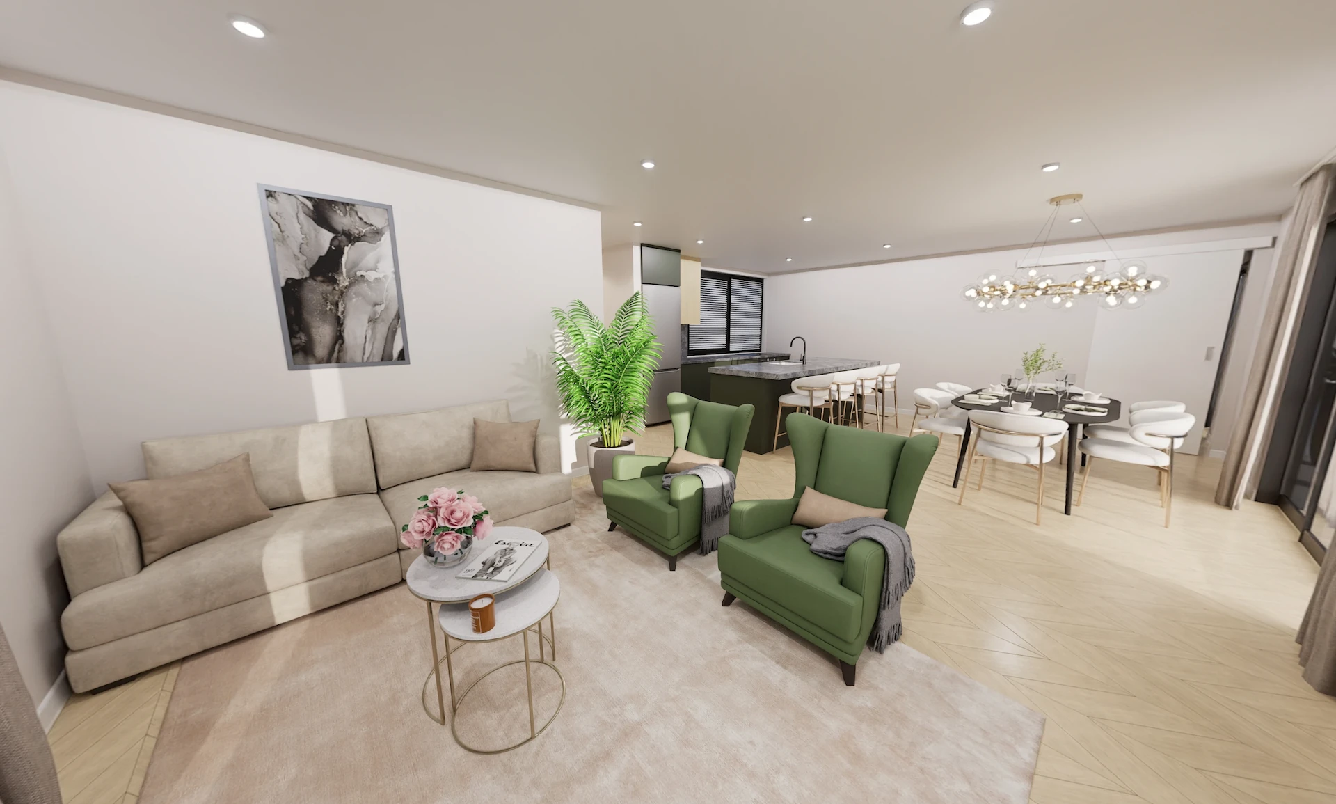 - Two living areas (4.8m x 6.0m & 4.4m x 4.3m)