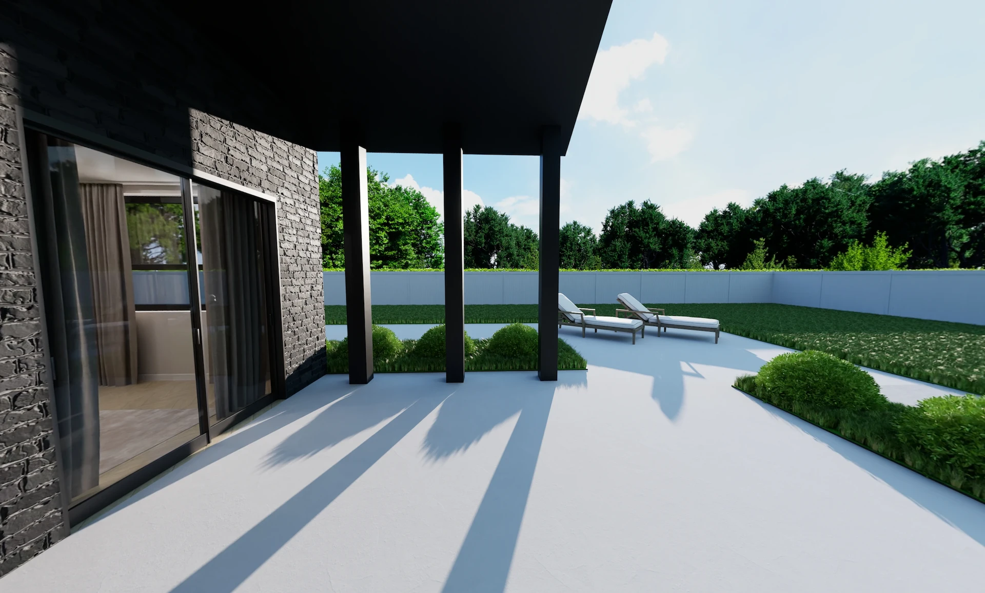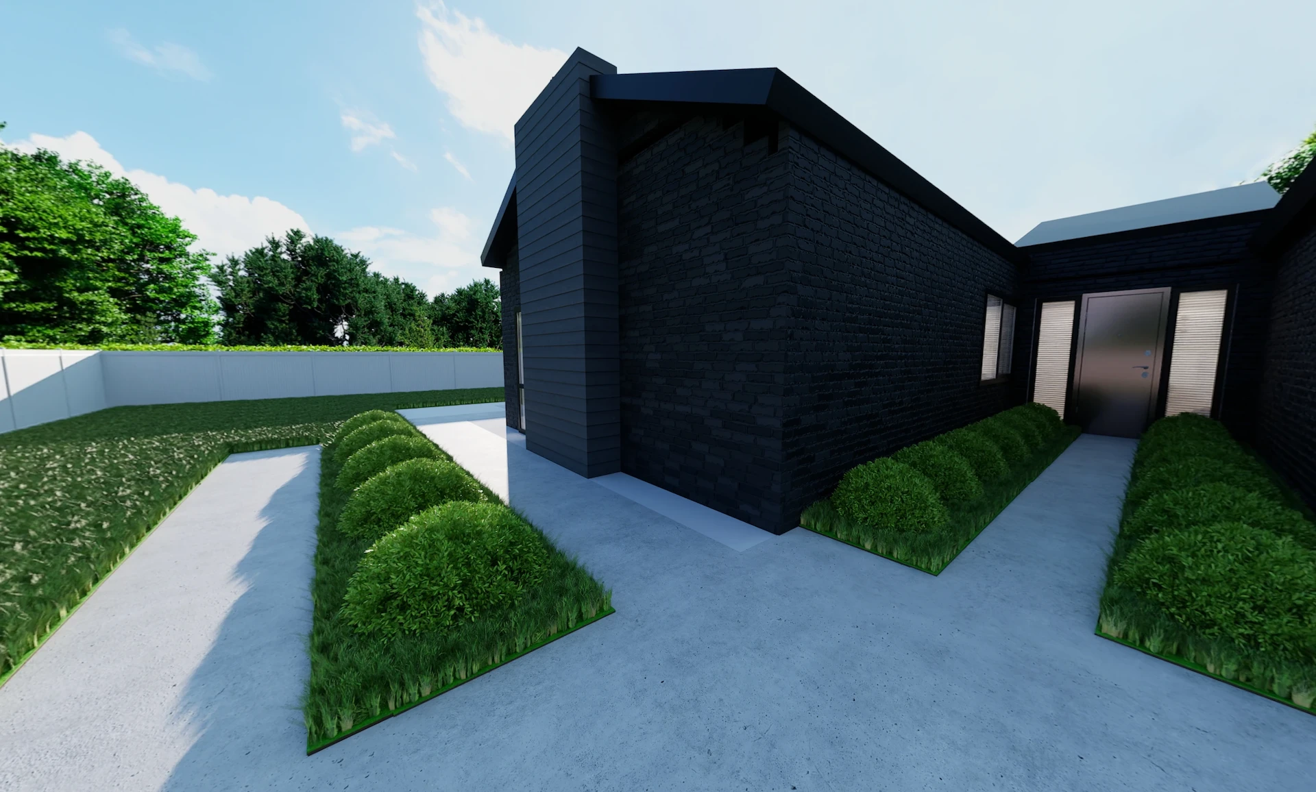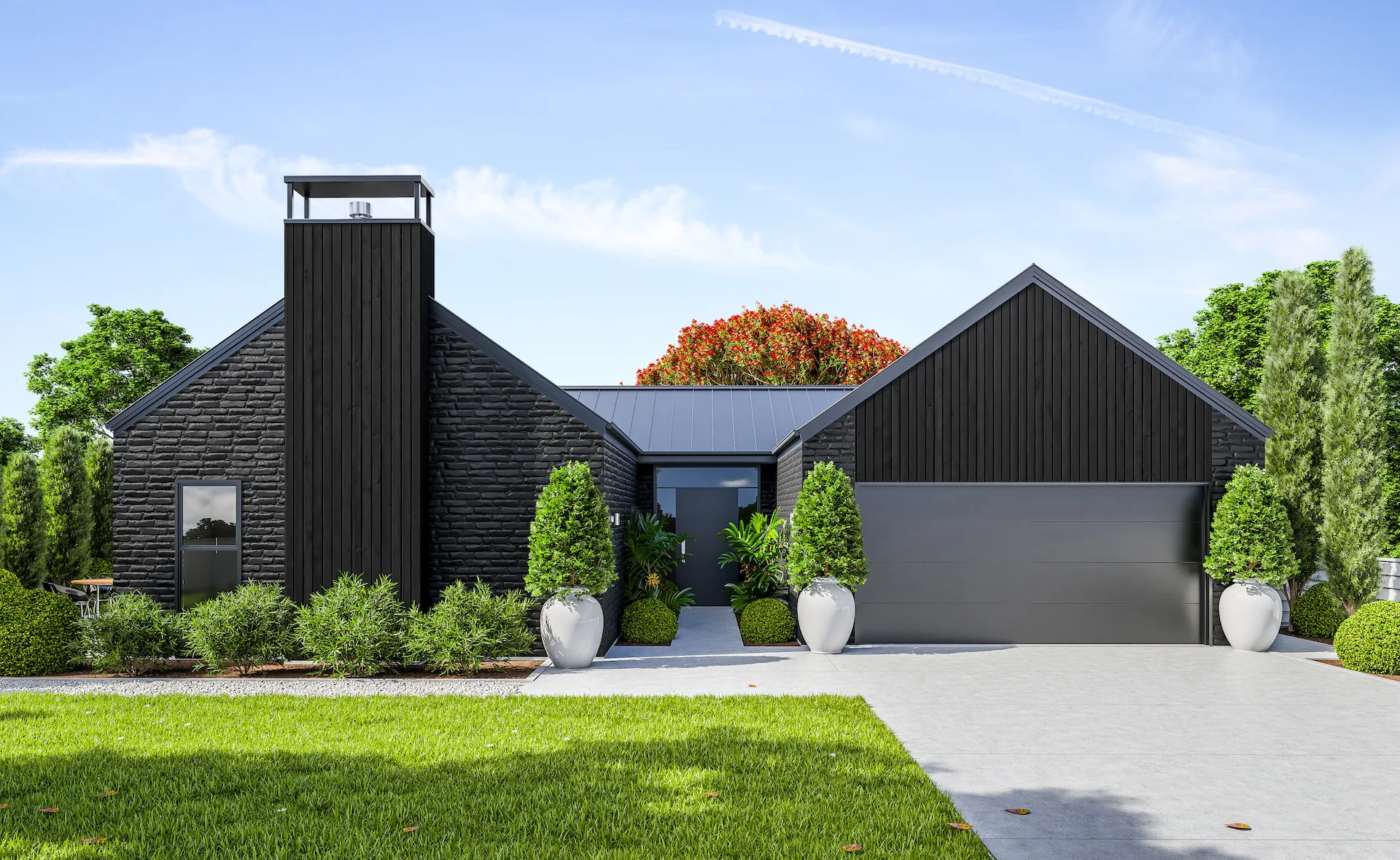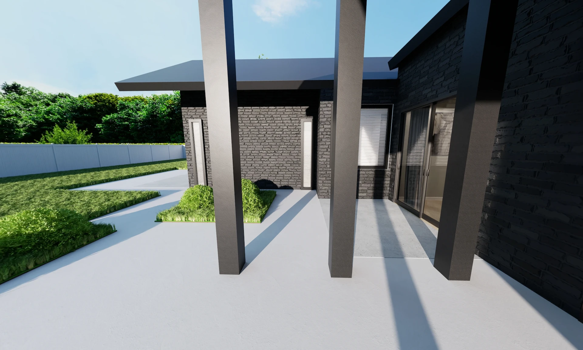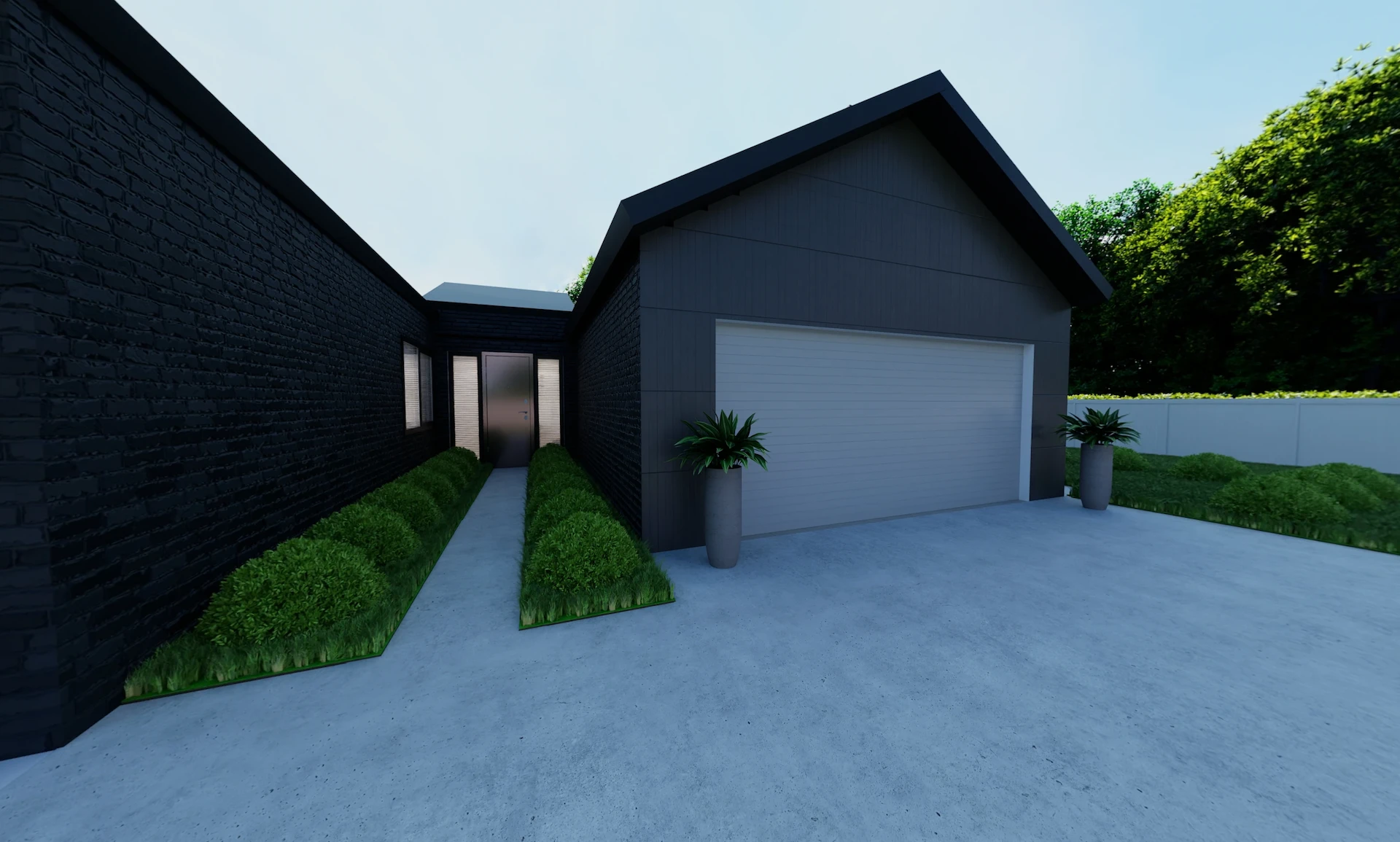 - Mixed cladding: brick veneer + vertical charred shiplap